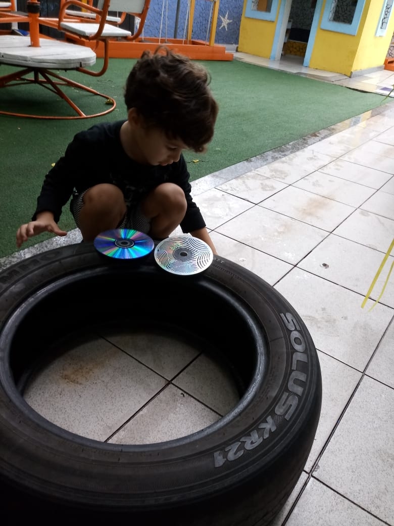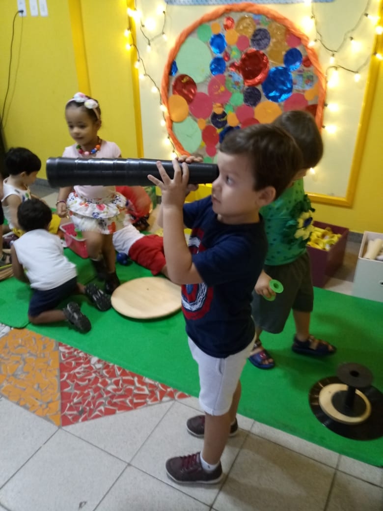 Olhares atentos e curiosos, aos poucos as crianças foram escolhendo os materiais, percebendo os detalhes e descobrindo suas possibilidades de exploração.
